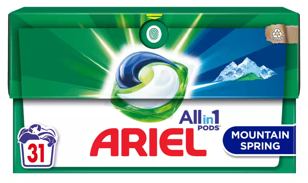 Ariel All-in-1 Pods Mountain Spring combineren krachtige reiniging met de verfrissende geur van berglucht. Elke pod bevat een complete formule die je was grondig schoonmaakt, hardnekkige vlekken verwijdert, kleding beschermt en langdurige frisheid achterlaat. Dankzij de handige pods gebruik je altijd de juiste hoeveelheid wasmiddel, zonder verspilling.