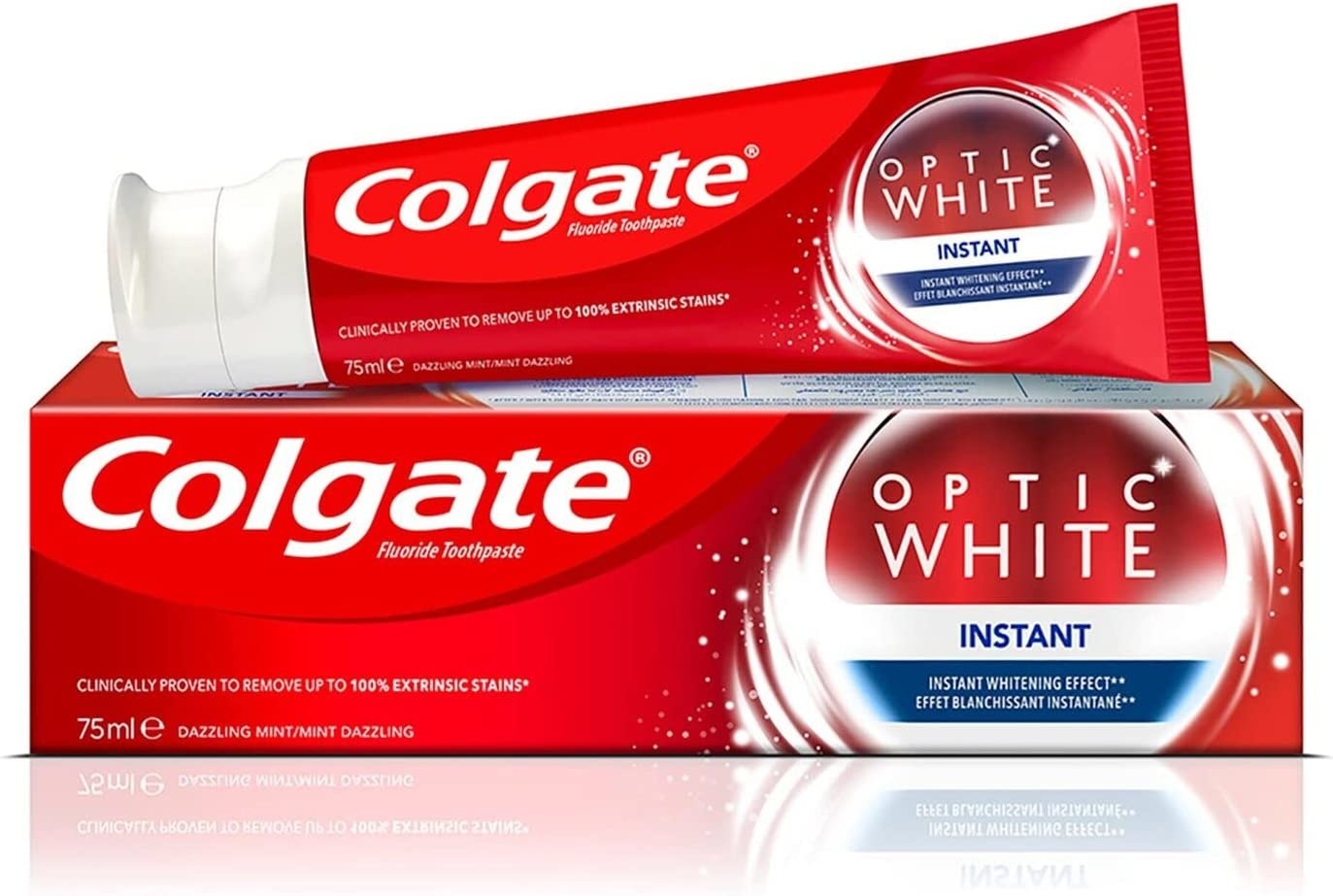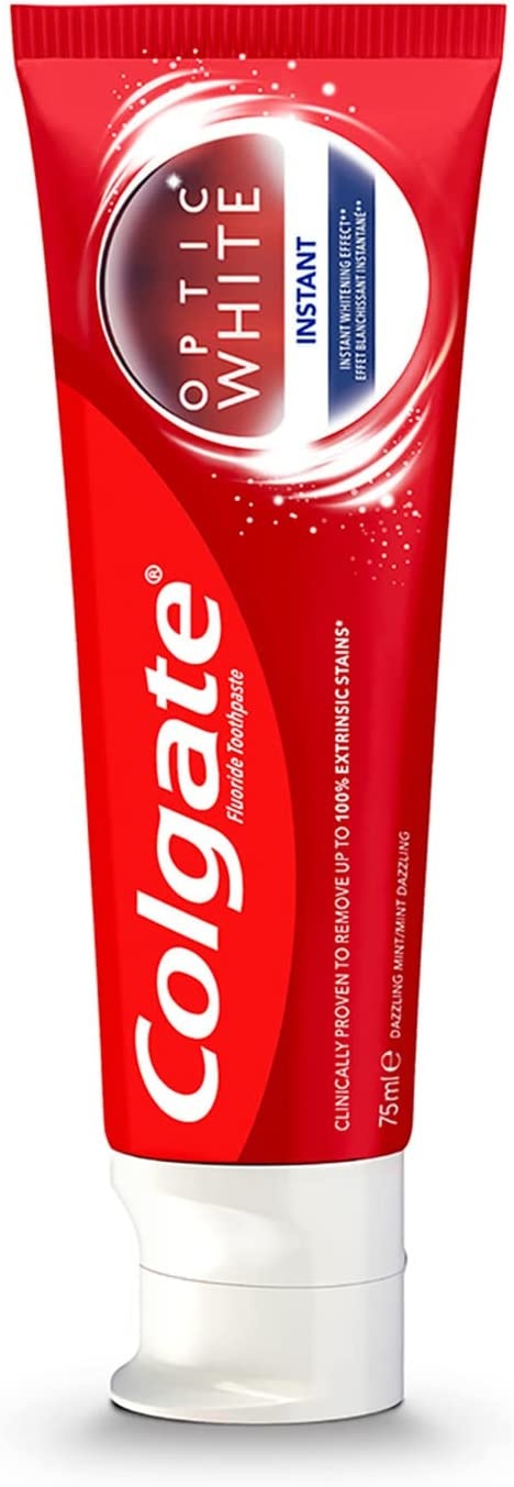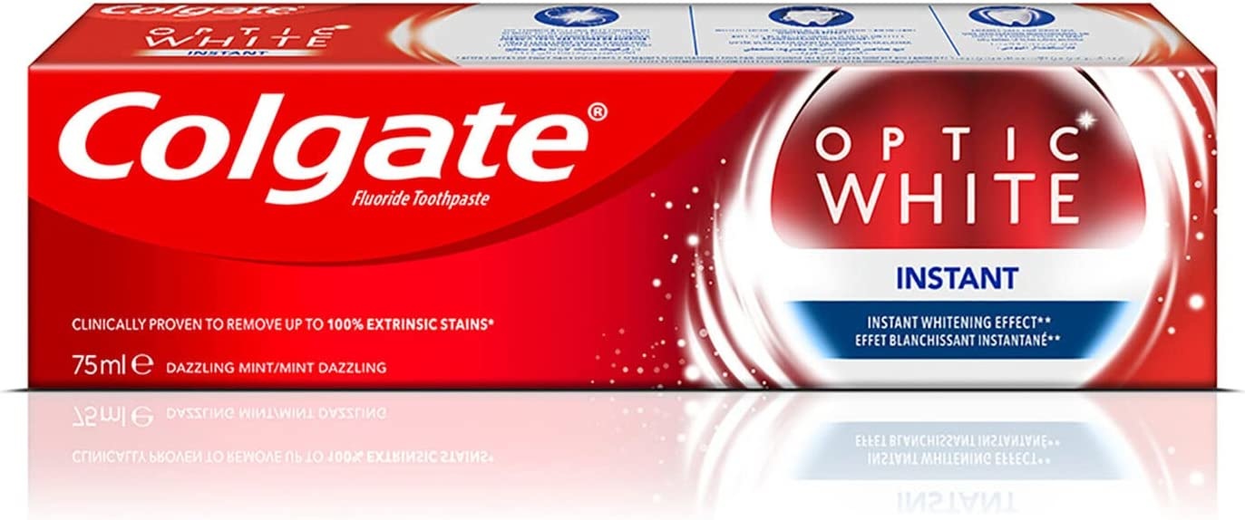 Colgate White Optic Instant tandpasta zorgt voor direct* mooie, witte tanden. De Colgate White Optic Instant tandpasta bevat een klinisch bewezen formule dat 100% van de oppervlaktevlekken verwijdert. De Colgate White Optic Instant tandpasta bevat optische witmakers voor een krachtig en direct whitening effect. Het effect is tijdelijk. Klinisch bewezen formule en dagelijks gebruik is veilig voor het glazuur.