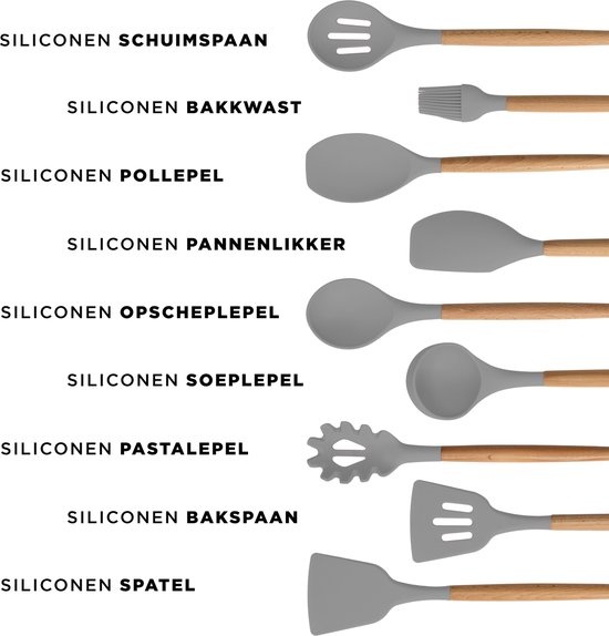 Onze 13-delige kookgerei set is gemaakt van hoogwaardig siliconen materiaal, dat hittebestendig en duurzaam is.