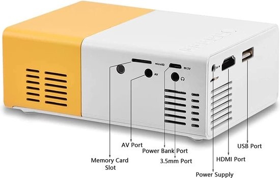 De kleine projector is uitgerust met meerdere poorten, waaronder USB-, audio- en andere interfaces. Hij kan probleemloos worden aangesloten op meerdere media-apparaten zoals tv-boxen, laptops, desktopcomputers en digitale camera's.