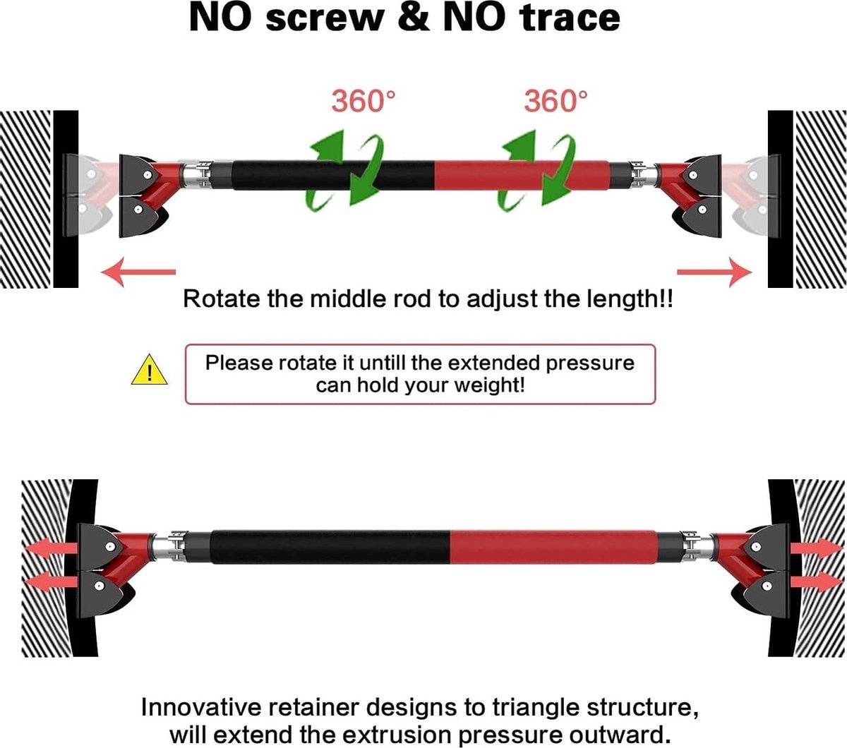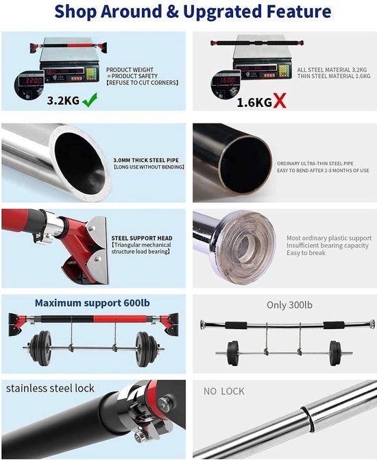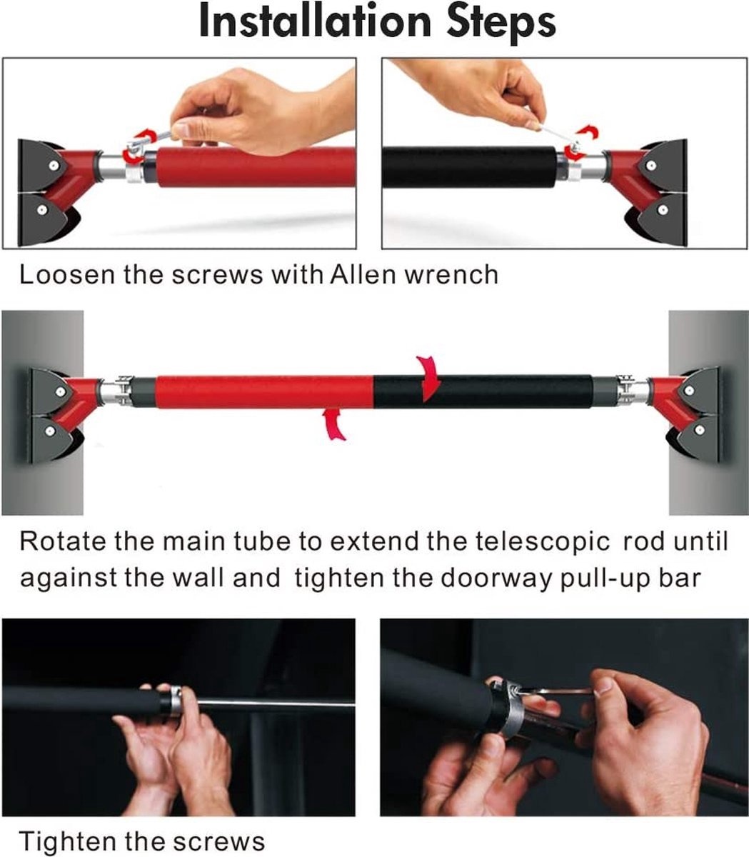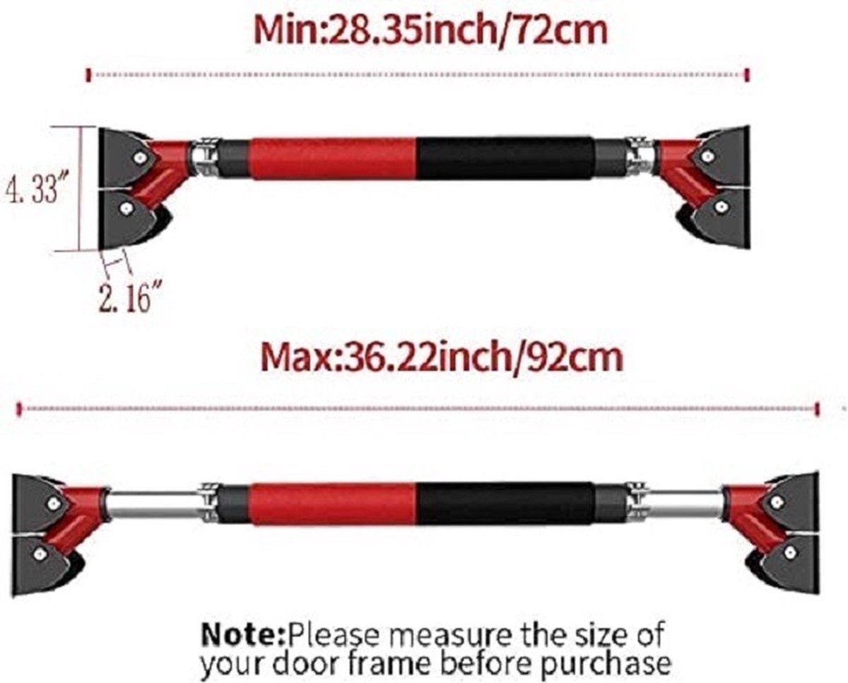 Geen schroeven en geen boren: eenvoudig op te zetten, draai gewoon aan de stang om hem tegen het deurkozijn te drukken en sluit het veiligheidsslot aan. Verstelbaar tussen 72-92 cm (28,3-36,2 inch), past op de meeste deurkozijnen, kan in enkele seconden worden gemonteerd en gedemonteerd. Perfect voor uw huis, garage of kantoor. Je hoeft niet naar de sportschool.