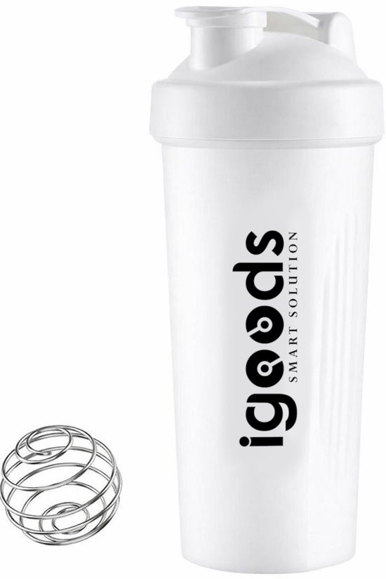 Igoods Shakebeker – Met RVS Mixerbal – BPA-vrij & Lekvrij – Shaker voor Proteïne Shakes, Smoothies & Sportvoeding – Fitness Shake Cup – 600ml – Wit