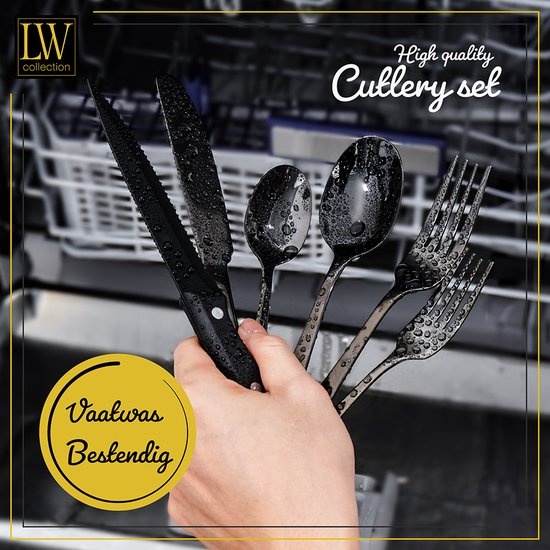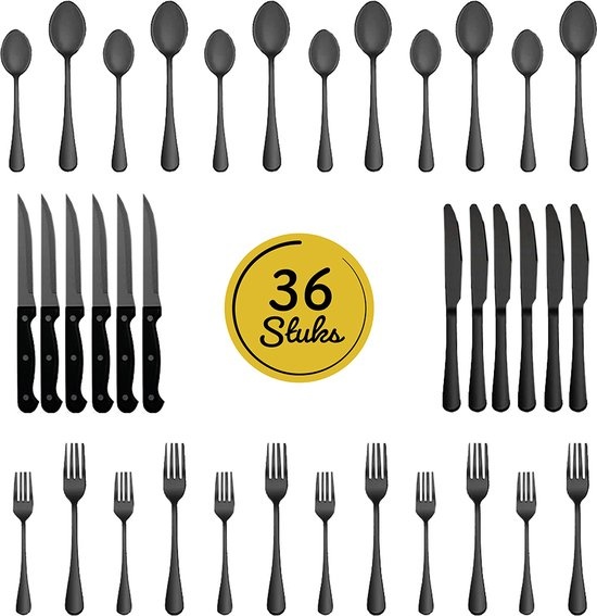 LW Collection bestekset 6 persoons 36 stuks Zwart - bestek set zwart vaatwasserbestendig - Lepels, Messen, Vorken & Steakmessen
