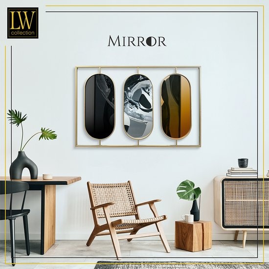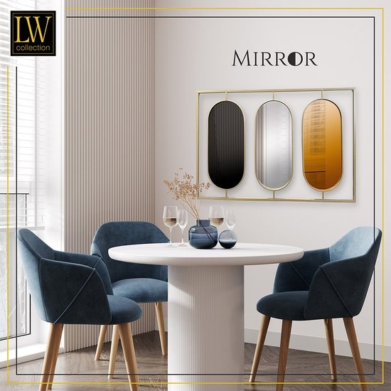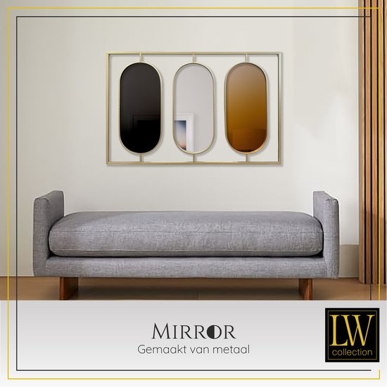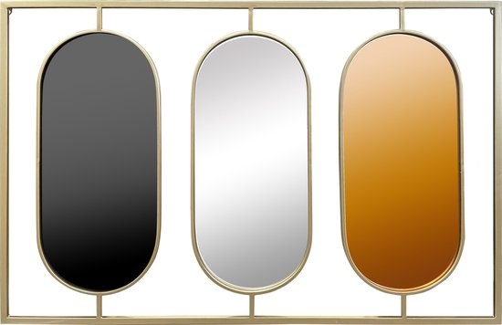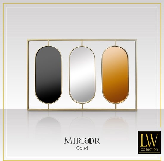 De grote spiegel heeft een afmeting van 109 x 70 (breedte x hoogte) cm en bevat drie ovale spiegels. De ovale spiegels zijn alle drie afgewerkt met een andere kleur. De linker ovale spiegel heeft een goudkleurige afwerking, de middelste een zilveren afwerking en de rechter ovale spiegel heeft een koperkleurige afwerking. Het frame is gemaakt van metaal en afgewerkt met een gouden poedercoating. Hang deze unieke muurspiegel eenvoudig op aan de twee ogen aan de achterkant. De goudkleurige spiegel is uiteraard ook geschikt om neer te zetten of ergens op te plaatsen.