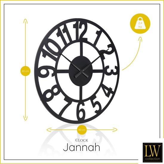 Wandklok JannahEen grote moderne klok is tijdloos en past in vrijwel iedere ruimte. Onze zwarte cijferklok uit de serie Jannah geeft uw kamer een frisse look. De combinatie van strak en sjiek maakt deze grote zwarte klok bijzonder en uniek. ModernDe moderne klok Jannah hangt bij onze klanten in verschillende ruimtes; woonkamers, keukens, kinderkamers en in de hal. Bent u uw inrichting over een tijdje zat? Verplaats de klok dan gemakkelijk naar een andere ruimte waar deze net zo goed tot zijn recht komt. Klok Jannah heeft een afmeting van 80 cm en komt uit onze exclusieve lijn LW Collection.Over het merk: Het team van LW Collection heeft veel passie voor interieur inrichting. Wij vinden dat iedereen in een huis moet wonen waar ze van houden. Het merk LW Collection is opgericht uit passie voor woonaccessoires. LW Collection is dagelijks bezig om unieke en moderne producten te ontwerpen. Zo biedt LW Collection onder andere unieke exclusieve wandklokken aan.