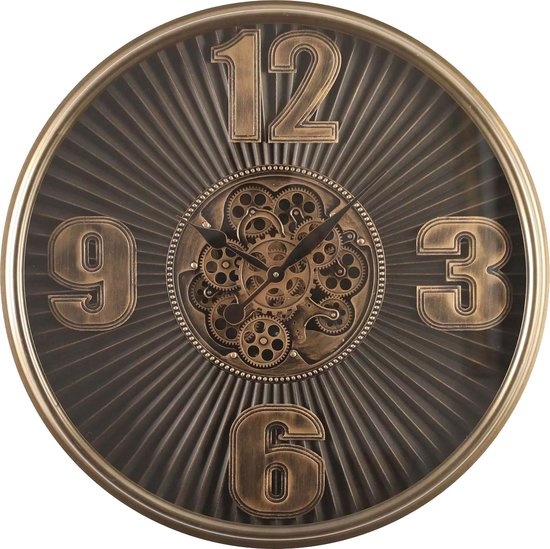 LW Collection wandklok met draaiende tandwielen brons bruin 80cm met glasplaat - Radar wandklok brons bruin - wandklok met bewegende wandwielen