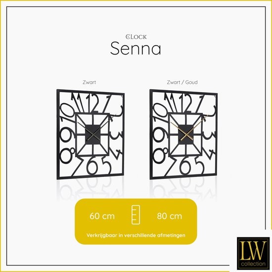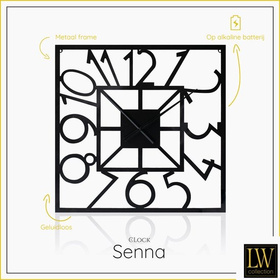 Klok Senna 80cmJe loopt je huiskamer in maar je mist iets. Je bent op zoek naar een eyecatcher die de inrichting van je kamer helemaal afmaakt. Deze eyecatcher is de vierkante SENNA wandklok met een grootte van maar liefst 80CM. De moderne zwarte klok hangt bij onze klanten in verschillende ruimtes; woonkamers, keukens, kinderkamers en in de hal. Unieke vierkante klokDe unieke zwarte klok is gemaakt van metaal en geproduceerd van de beste materialen. Deze stijlvolle vierkante klok is exclusief verkrijgbaar bij LW Collection.Over het merk: Het team van LW Collection heeft veel passie voor interieur inrichting. Wij vinden dat iedereen in een huis moet wonen waar ze van houden. Het merk LW Collection is opgericht uit passie voor woonaccessoires. LW Collection is dagelijks bezig om unieke en moderne producten te ontwerpen. Zo biedt LW Collection onder andere unieke exclusieve wandklokken aan.