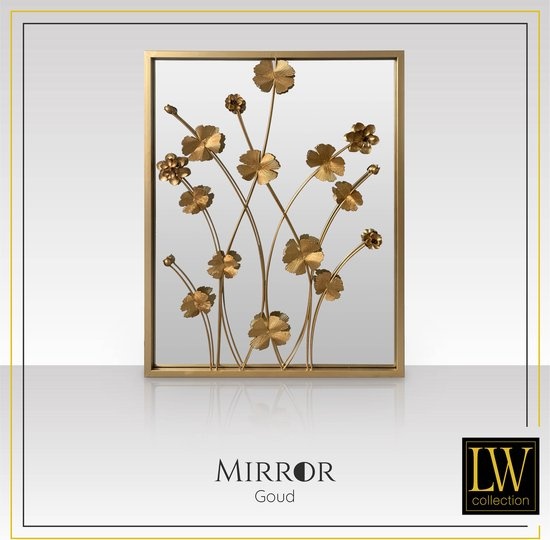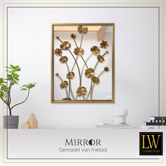 LW Collection wandspiegel goud rechthoek 61x70 cm metaal - grote spiegel muur - industrieel - woonkamer gang - badkamerspiegel - muurspiegel slaapkamer gouden rand - hangspiegel met luxe design met bloemen
