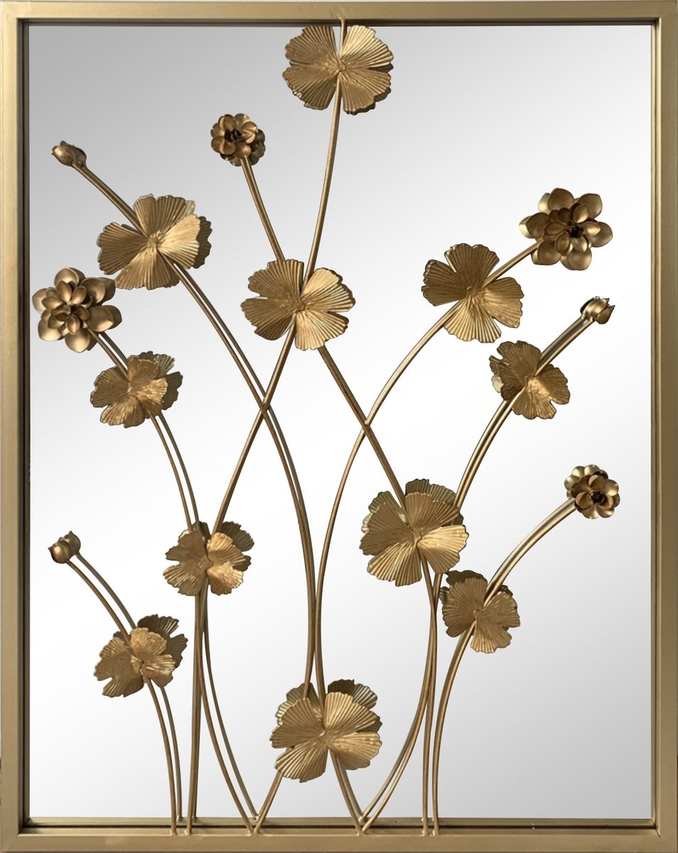 Deze exclusieve spiegel heeft een mooi organisch ontwerp met bloemen. Zowel het frame als de bloemen zijn gemaakt van metaal met een goudkleurige poedercoating. De unieke muurspiegel is een echte eyecatcher in bijvoorbeeld uw woonkamer, slaapkamer, kinderkamer of studeerkamer. De rechthoekige spiegel heeft een afmeting van 61 x 70 (breedte x hoogte) cm en heeft een dunne metalen rand. Dit geeft de gouden wandspiegel een moderne look. De moderne spiegel kunt u eenvoudig ophangen aan het oog aan de achterkant. U kunt er ook voor kiezen om de spiegel niet op te hangen, maar ergens op te plaatsen.
