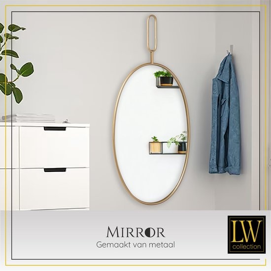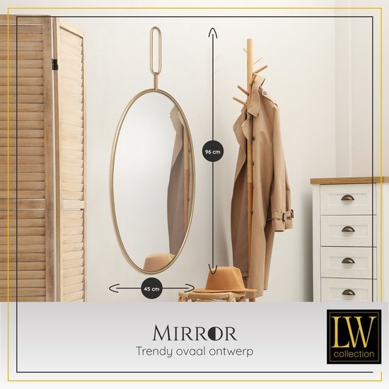 LW Collection wandspiegel goud rond ovaal 45x96 cm metaal - grote spiegel muur - industrieel - woonkamer gang - badkamerspiegel - muurspiegel slaapkamer gouden rand - hangspiegel met luxe design