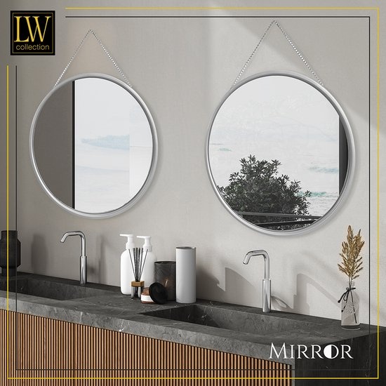 LW Collection wandspiegel met touw zilver rond 50x50 cm metaal - grote spiegel muur - industrieel - woonkamer gang - badkamerspiegel - muurspiegel slaapkamer zilveren rand - hangspiegel met luxe design