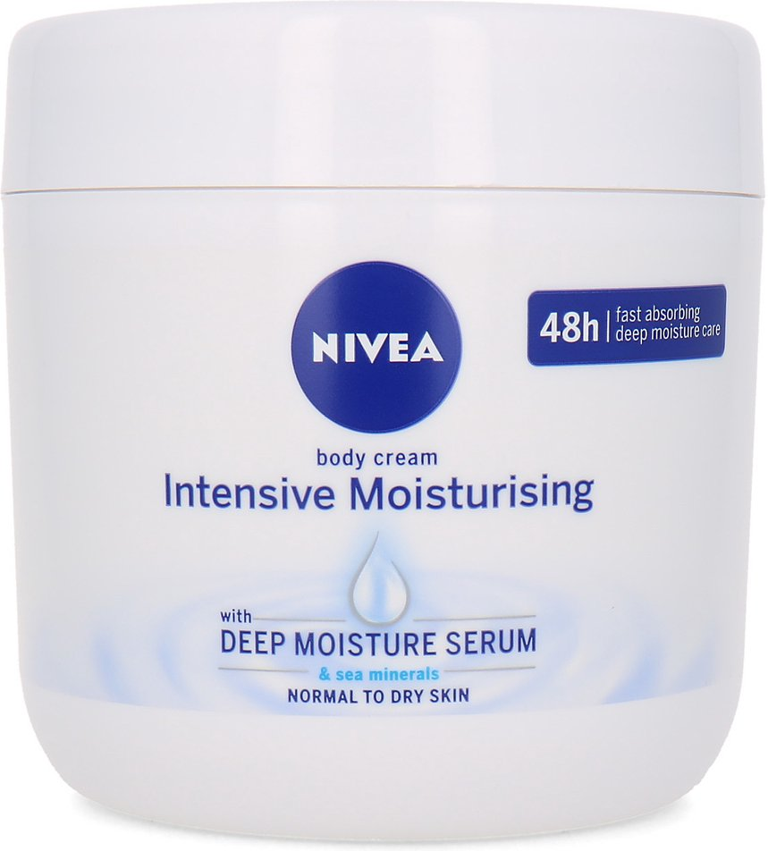 De Nivea 48H Intensive Moisturizing Body Cream – 400 ml is een intens hydraterende bodylotion. De lotion bevat zee mineralen die tot diep in de huid hydrateren en verzorgen. Je huid zal tot wel 24 uur lang gehydrateerd aanvoelen.