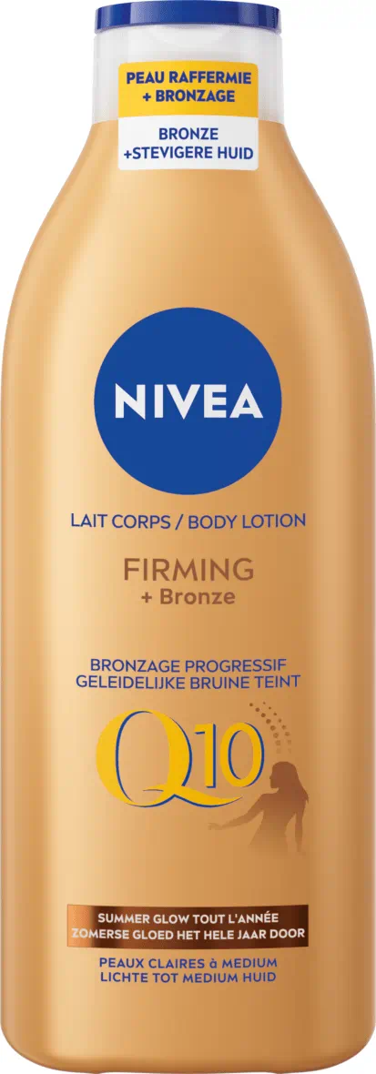 Zeg hallo tegen je zomerse gloed! De NIVEA Q10 Firming + Bronze Body Lotion geeft je een natuurlijk gebruinde teint voor een stralende en zomerse huid.