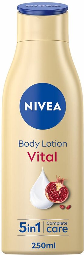 Nivea Bodylotion VitalEen heerlijke bodylotion van Nivea. De formule met soja en granaatappel geeft je huid de verzorging die het nodig heeft. De huid wordt sterker, steviger en heeft dus meer weerstand. De ingredinten zorgen voor een stimulatie van de collageen, waardoor je minder snel last hebt van irritaties.