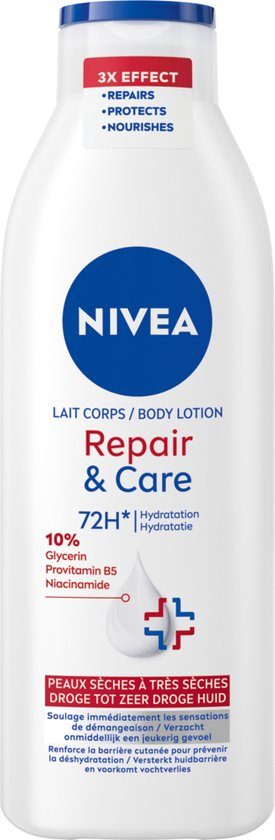 NIVEA Repair & Care Lotion versterkt je huidbarrière. De huidverdraagzaamheid is dermatologisch goedgekeurd. De formule heeft 3x effect – ondersteunen, beschermen en voeden - biedt de verzorging die je huid nodig heeft. De lotion bevat 10% Glycerine complex en Provitamine B5 en Niacinamide. Verzacht een jeukerig huidgevoel onmiddellijk. NIVEA Repair & Care intensieve lotion is perfect voor de droge en zeer droge huid. Het biedt tot 72 uur* hydratatie. Het heeft een niet-vettige textuur en absorbeert snel. Voor het beste resultaat raden we aan om deze bodylotion dagelijks op je hele lichaam aan te brengen.