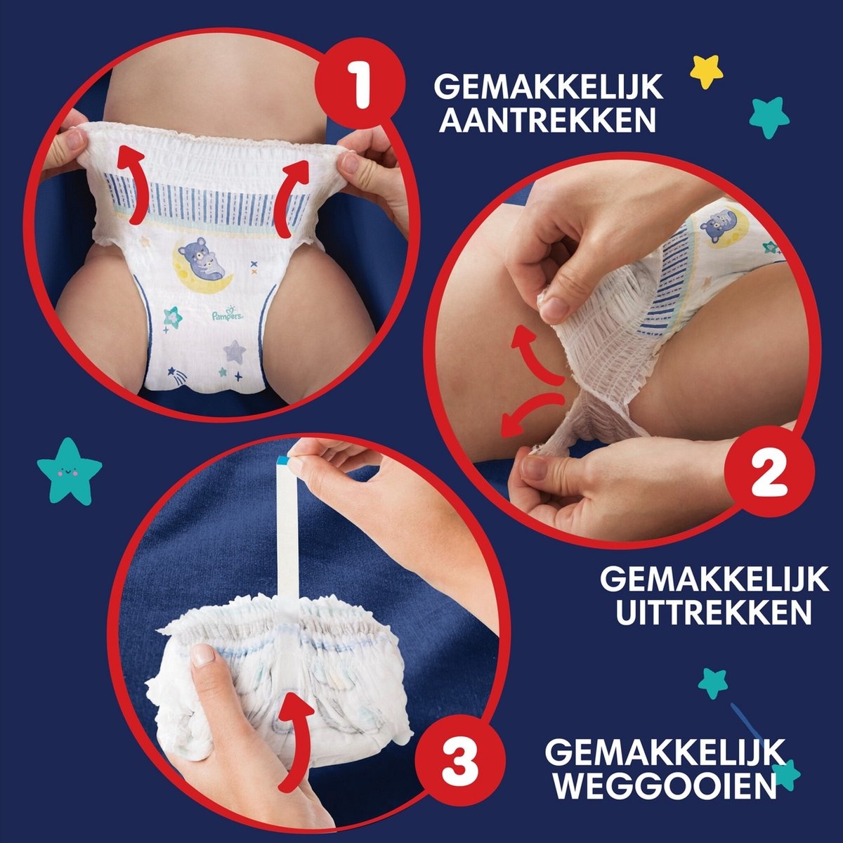 Net als alle andere Pampers luierbroekjes zijn de Pampers Night Pants heel eenvoudig te verschonen, zelfs als je baby veel beweegt: je trekt ze in één beweging aan, scheurt de zijkanten open om ze uit te trekken, rolt ze op en gebruikt de plakstrip om ze weg te gooien.