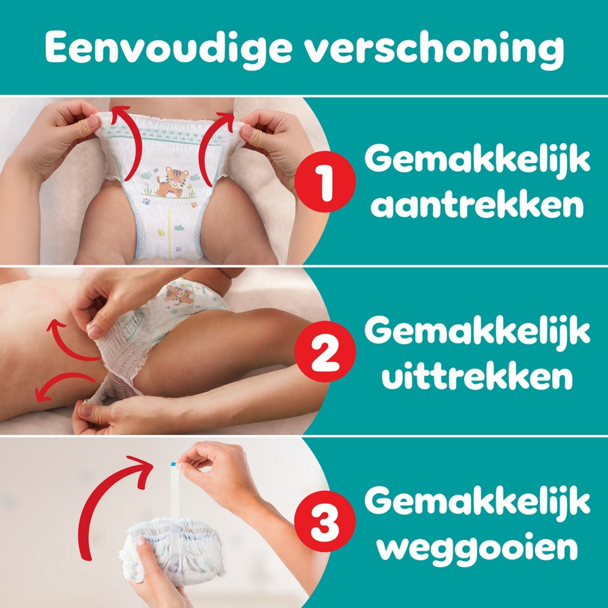 - Eenvoudig verschonen: gemakkelijk aantrekken, openscheuren, oprollen, plakken en weggooien